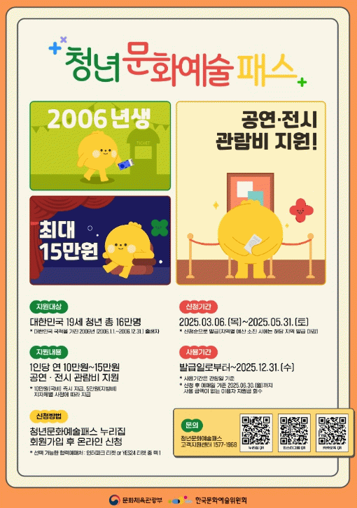 ‘청년문화예술패스’는 사회에 첫 발을 딛는 19세 청년에게 공연(연극, 뮤지컬, 클래식, 콘서트, 음악 페스티벌 등), 전시 관람비를 지원해 문화 향유 기회를 제공하는 사업이다.