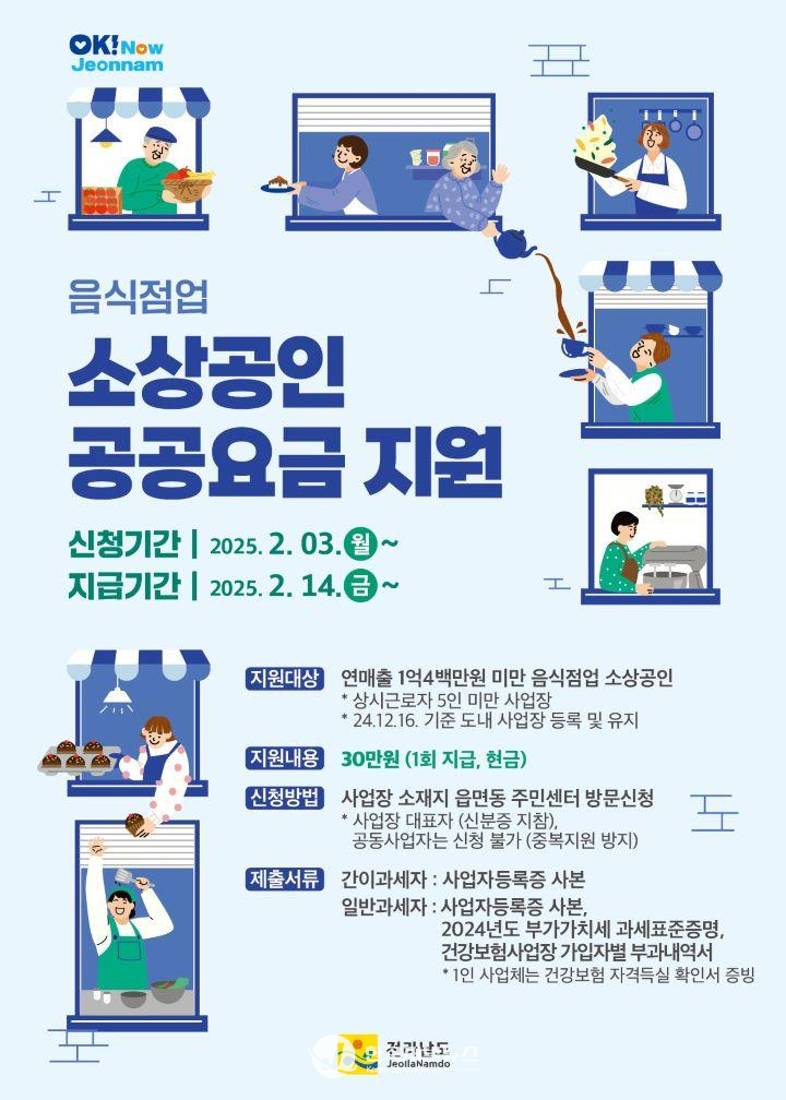 지원 대상자는 2024년 12월 16일 현재 전남에 사업장을 등록하고 신청 기간까지 사업을 유지 중인 음식점업 소상공인으로 상시근로자 5인 미만, 연매출액은 1억 400만 원을 넘지 않아야 한다.