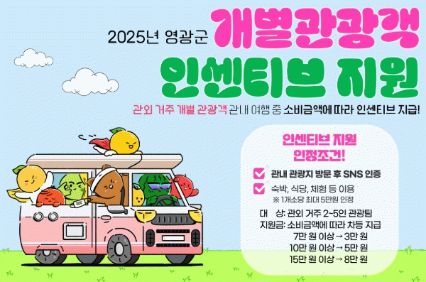 영광군 개별관광객 유치 인센티브 지원사업은 관광객 유치를 도모하고 지역경제 활성화를 견인하기 위해 여행경비 일부를 지원하는 사업으로 연내 예산 소진 시까지 진행된다.