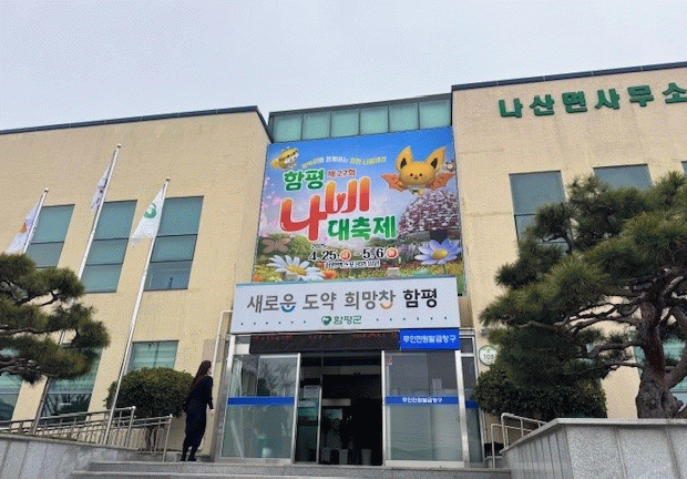 함평군은 11일 “나산면사무소가 지난 10일 청사에 대형현수막을 설치해 지역 주민과 방문객들에게 제27회 함평나비대축제를 알리며 관심과 참여를 장려하고 있다”고 밝혔다.