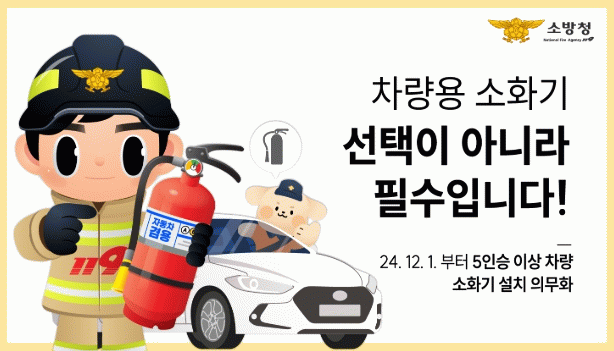 지난해 12월 1일 ‘소방시설 설치 및 관리에 관한 법률’개정안이 시행됨에 따라 기존 7인승 이상 차량에서 5인승 이상 차량으로 소화기 비치 의무화 대상이 확대됐다.