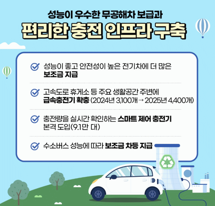 승용차 구매 시 다자녀 가구는 자녀 수에 따라 최대 300만 원, 전기택시는 250만 원, 차상위 이하 계층과 청년 생애 첫 구매자는 국비 지원액의 20%가 추가 지원된다.