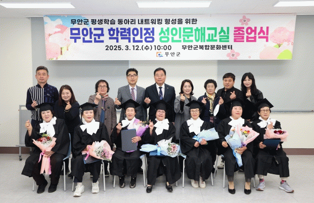 무안군 초등학력인정 성인문해교실은 전라남도교육감이 지정한 3단계 과정으로 진행됐으며, 84세의 한야례 어르신 등 졸업생 7명은 2022년부터 3년간 초등 1~3단계 과정을 수료해 빛나는 졸업장과 학력 인정서를 받는 기쁨을 누리게 됐다.