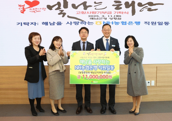하정필 지부장은“농협은행은 지역사회와 상생하는 금융기관으로서 해남군의 고향사랑기부제 정착과 활성화를 위해 지속적으로 노력해 왔다”며“이번 기부를 통해 해남 지역 발전에 많은 도움이 되길 바라고, 해남의 우수한 농수축산물이 고향사랑답례품을 통해 더욱 널리 알려지길 기대한다”고 말했다.