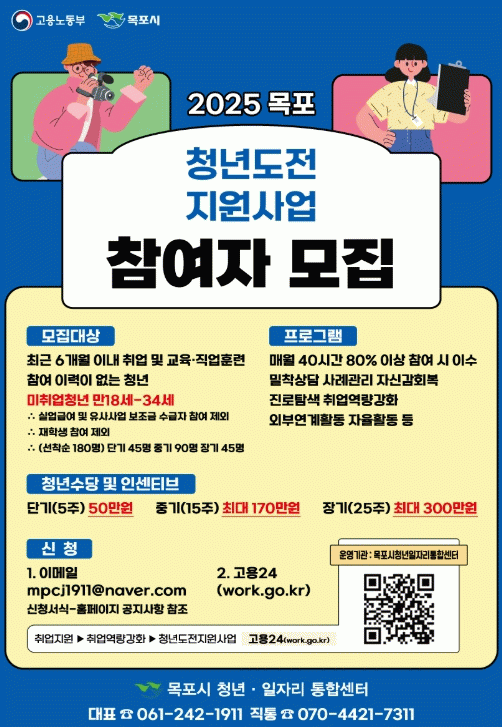 자세한 사항은 목포시 청년·일자리통합센터로 문의하면 된다.