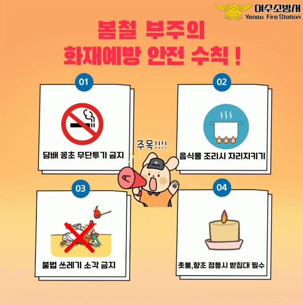 이에 따라 여수소방서는 부주의 화재예방을 위해 ▲담배꽁초는 불씨 제거 후 처리 ▲음식물 조리 시 자리 비움 금지 ▲논·밭 쓰레기 소각 금지 등 화재예방수칙을 지속적으로 홍보할 계획이다.