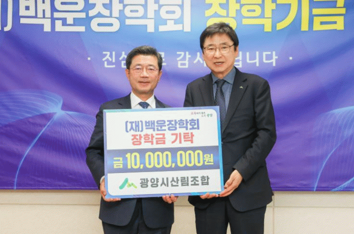 광양시산림조합은 2016년 5백만 원, 2022년 1천만 원에 이어 올해도 학생들이 경제적 어려움 없이 학업에 매진할 수 있도록 1천만 원을 후원해 총 2천5백만 원을 기탁했다.