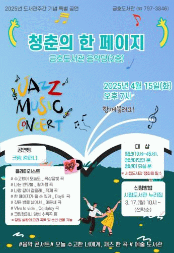 김미라 도서관과장은 “이번 행사를 통해 금호도서관이 지역주민과 상생해 예술 인프라의 중심지가 되길 바란다”며 “도서관 주간을 맞아 이외에도 많은 행사들을 진행하니 관심과 참여를 부탁드린다”고 말했다.