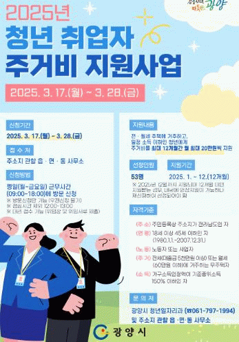 신청자격은 광양시에 주소를 둔 18세 이상 45세 이하 청년 노동자 및 사업자로 가구소득 인정액이 기준중위소득 150% 이하이며, 전세 대출금 5천만 원 이상 또는 월세 60만 원 이하에 거주하는 무주택자이다.
