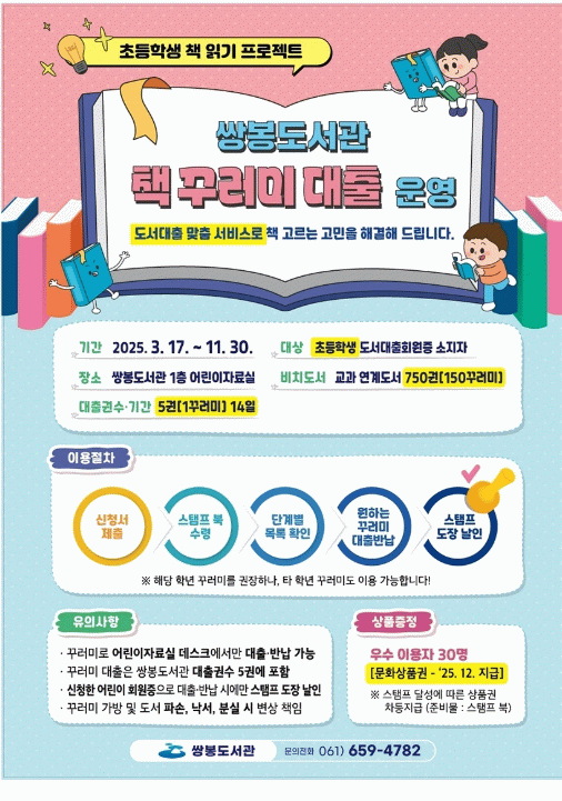단계별 꾸러미 도서 목록은 쌍봉도서관 어린이자료실 또는 여수시립도서관 누리집에서 확인할 수 있다.