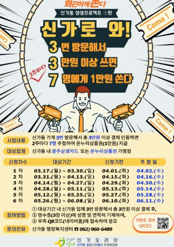 신청 방법은 신가동 내에서 광주상생카드 또는 온누리상품권 가맹점을 3번 방문하고 3만 원 이상 결제한 후 영수증에 성명과 연락처를 기재해 정보무늬(QR코드)를 통해 네이버 폼으로 신청하면 된다.