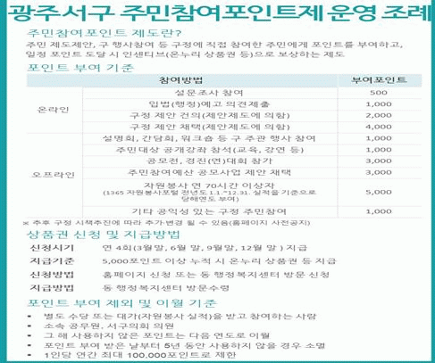 이번 주민조례청구로 접수된‘광주광역시 서구 주민참여포인트제 운영 조례안’은 광주광역시 서구에서 실시하는 각종 제도, 정책 등에 주민의 적극적인 참여를 유도하기 위해 참여에 따라 포인트를 부여하고, 일정 포인트 도달 시 인센티브를 부여하는 제도이다.