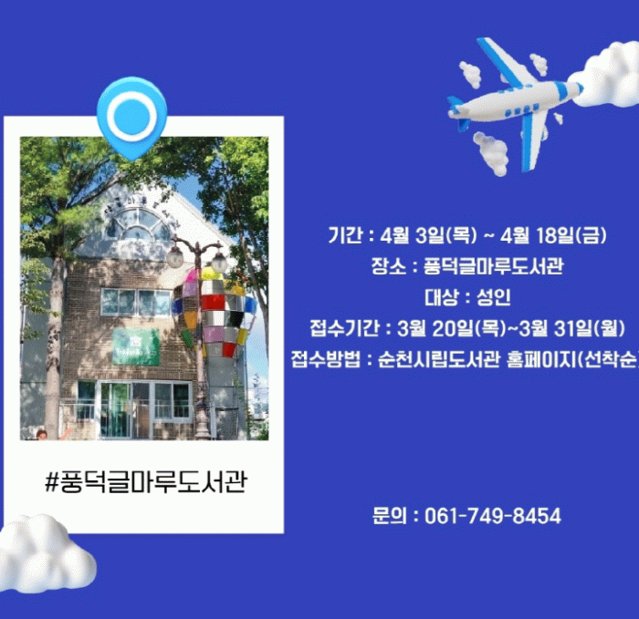 ‘여행 작가와의 만남’ 강연 신청은 3월 20일부터 3월 31일까지, 영화 관람 신청은 각 상영일 2주 전 순천시립도서관 누리집 또는 전화로 가능하다.
