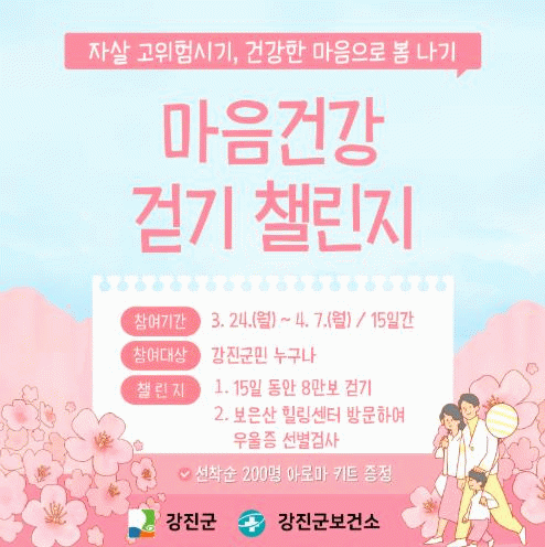 한준호 강진군 보건소장은 “꾸준한 운동은 마음건강에 도움이 된다. 이번 걷기 챌린지를 통해 군민들이 몸과 마음을 돌보며 건강하게 관리하는 계기가 되길 바란다”라며 “앞으로도 마음건강에 대한 관심을 끌어올리고 조기 발견과 치료를 위한 업무에 최선을 다하겠다”고 말했다.