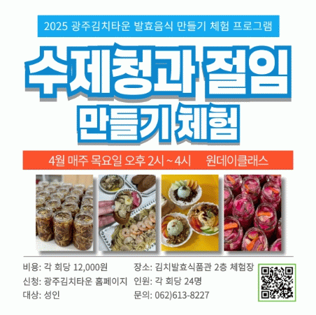 노형근 김치타운관리사무소장은 “적은 체험 비용으로 수제청, 궁중요리, 떡 등 다양한 음식을 배울 수 있는 가성비 높은 체험 프로그램을 마련하고 있다”며 “시민 여러분들의 많은 관심과 참여를 바란다”고 말했다.