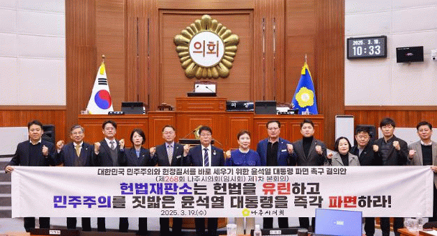나주시의회는 이날 채택된 결의문을 대통령실, 국회, 헌법재판소, 행정안전부, 법무부에 전달할 예정이다.