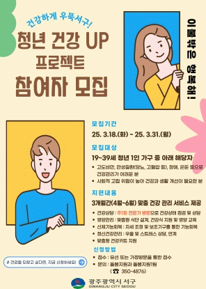 프로젝트 운영 기간은 4월 7일부터 7월 4일까지며 참여를 희망하는 청년은 오는 31일까지 서구청 돌봄지원과로 신청하면 된다.