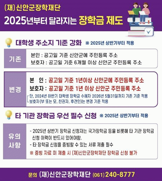 아울러, 2025년 상반기부터 신안군장학재단 장학금을 신청하는 대학생은 타 기관 장학금 우선 신청이 필수로 적용된다.