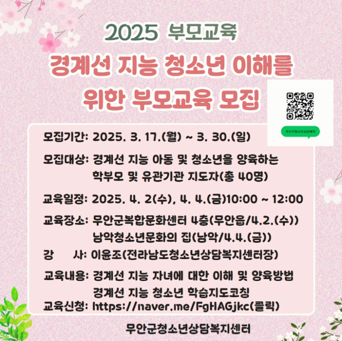 특강은 청소년 보호자 및 관심 있는 양육자 40명을 대상으로 오는 30일까지 선착순 모집하며, 무안군청 홈페이지 공지사항을 참고하거나 무안군 청소년상담복지센터 인스타그램을 확인해 신청하면 된다.