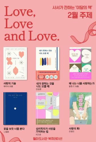 지난 2월의 주제는 ‘러브, 러브, 그리고 러브(LOVE, LOVE AND LOVE)’로 에리히 프롬의 '사랑의 기술' 등 가족, 연인들 간의 사랑에 관한 책 12권을 선정했고, 3월에는 ‘봄, 반짝반짝’이란 주제로 새로운 시작을 준비하는 사람들에게 힘을 줄 수 있는 책인 코리 도어펠드의 '가만히 들어주었어' 등 12권을 선정해 소개하고 있다.