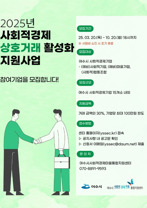 참여를 희망하는 사회적경제기업은 여수시 또는 여수사경센터 누리집 공지사항을 확인해 신청서를 작성한 후 전자우편으로 신청하면 된다.