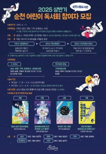 2025년 상반기 '순천 어린이 독서회'는 오는 24일 오전 10시부터 순천시립도서관 누리집에서 선착순으로 신청할 수 있으며 자세한 사항은 누리집을 참고하거나 기적의도서관으로 문의하면 된다.