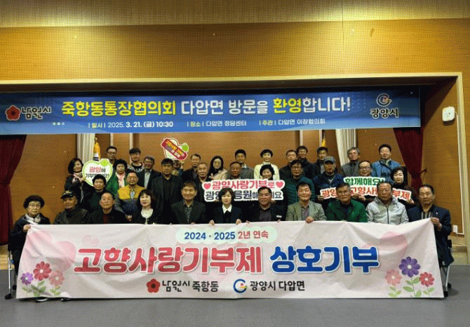 또한 이날 광양시 다압면은 고향사랑기부제의 성공적인 정착과 자매결연도시 간 상생·발전을 위해 남원시 죽항동과 고향사랑기부제 상호기부에 동참했다고 밝혔다.