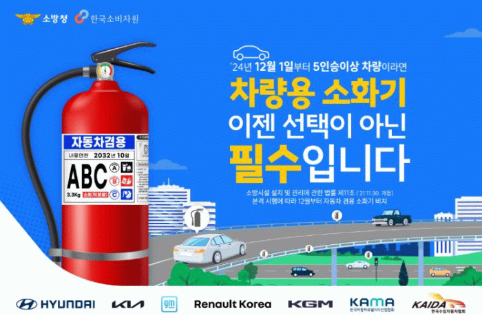 이번 개정으로 기존 11인승 이상 승합차 외에도 일부 일반 승용차와 전기차, 하이브리드 차량 등에도 소화기 설치가 의무화됐다.