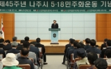 나주시 윤규진 기자2025. 05.19[한국저널뉴스]나주시는 5월 19일 오전 10시, 나주시민회관 2층 강당에서 ‘제45주년 5‧18 민주화운동 기념식’을 개최하고 오월 정신의 역사적 의미를 되새기는 시간을 가졌다. 이날 기념식은 ‘아! 오월, 다시 만난 오월’을 슬로건으로 윤병태 나주시장과 신정훈 국회의원, 이재남 시의장, 김석기 광주지방보훈청장을 비롯해 5‧18 유공자와 유족, 시민 등 200여 명이 참석했다. 행사는 식전 추모공연을 시작으로 국민의례, 기념사, 추념사, ‘임을 위한 행진곡’ 제창, 헌화와 분향순으로 이어졌다. 이날 추모공연은 만월 놀이패 살풀…