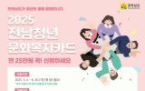 의회 윤규진 기자2025. 03.10[한국저널뉴스]전남 무안군은 청년의 문화생활 향유와 자기발전 기회를 지원하는 ‘전남청년 문화복지카드 지원사업’ 대상자를 6월까지 상시 모집한다. 지원 대상은 2023년 3월 4일 이전부터 전라남도에 주소를 두고 계속 거주하고 있는 19세 이상 28세 이하(1997 부터 2006년 출생) 청년이며 1인당 연 25만원의 문화복지비를 지원한다. 다만 ▲복지포인트(카드)를 받는 공공기관의 근무자 ▲학교 밖 청소년 교육수당 지급 대상자 ▲전라남도 여성농업인 바우처 대상자는 이번 사업에서 제외되며, 문화누리카드 지원 대상자에게는 문화누리비…