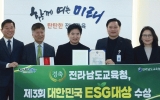강진군 윤규진 기자2024. 12.18[한국저널뉴스]전라남도교육청이 17일 서울 성동광진교육지원청에서 열린 아름다운학교운동본부 주관 ‘제3회 대한민국 ESG 대상 시상식’에서 ESG 확산 공로를 크게 인정받아 대상인 환경부장관상을 수상했다. 이날 시상식에서는 전남교육청을 비롯해 ESG 경영 문화 확산에 기여한 17개 기관이 상을 받았다. 주민직선 4기 공약에 따라 전국 교육청 최초로 ESG를 도입한 전남교육청은 지난해 ▲ ESG 지원센터 구축 및 도입계획 수립 ▲ ESG 교육 및 실천 조례 제정 ▲ ESG교육발전위원회 구성을 통해 기반을 마련했다. 올해는 ▲ E…