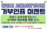 나주시 윤규진 기자2024. 09.26[한국저널뉴스]광양시는 9월 26일 오전 9시부터 10월 16일 오후 6시까지 ‘광양에 기부하고 K-POP 페스티벌 티켓 받자!’ 이벤트를 진행한다고 26일 밝혔다. 이번 기부 인증 이벤트는 올해 1월 1일부터 광양시에 5만 원 이상 기부한 고향사랑기부제 참여자들을 대상으로 실시한다. 참여 방법은 ‘고향사랑e음’에서 기부내역 현황 화면을 캡처해 이벤트 폼에 등록하고, 10월 25일(1일 차)과 10월 26일(2일 차) 입장권 중 하나를 선택해 응모하면 된다. 기존 기부자 외에 신규로 고향사랑 기부를 원하는 사람은 온라인에서는…