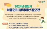 광양시 윤규진 기자2024. 07.01[한국저널뉴스]광양시는 아동 권리를 알리고 아동 권리가 존중되는 아동친화도시 조성을 위해 ‘2024년 광양시 아동권리 정책제안 공모전’을 7월 4일부터 8월 2일까지 진행한다고 밝혔다. 이번 공모 주제는 아동권리(▲생존권 ▲보호권 ▲발달권 ▲참여권)를 보장할 수 있는 광양시 정책 전반에 대한 자율주제로 진행되고, 광양시 거주 18세 미만 아동이면 누구나 참여 가능하다. 참여 방법은 광양시청 홈페이지에서 참가 신청서, 정책 제안서를 내려받아 공모 기간 내 이메일, 우편·방문 신청 중 선택해 제출하면 된다. 제출된 정책 제안은 시…