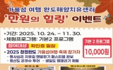 동구 윤규진 기자2025. 10.20[한국저널뉴스]완도해양치유센터에서 10월 24일부터 26일까지 개최되는 ‘2025 청정 완도 가을 섬 여행’과 연계하여 ‘만원의 힐링’ 이벤트를 진행한다. ‘만원의 힐링’ 이벤트는 ‘완도왔섬, 치유됐섬’을 주제로 개최되는 ‘2025 청정 완도 가을 섬 여행’을 하는 관광객이 가을 섬 여행과 함께 부담 없이 해양치유 프로그램을 즐길 수 있도록 마련됐다. 이벤트는 ‘청정 완도 가을 섬 여행’의 프로그램인 ▲제2회 명사십리 치유길 맨발 걷기 페스티벌 ▲청산도 은하수 투어 ▲생일도 멍때리기 중 1개 프로그램에 참가(확인증 지참)하…