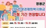 담양군 윤규진 기자2025. 10.16[한국저널뉴스]영광군은 전 군민에게 50만 원(2차분)을 지급하는 민생경제회복지원금 신청 기간을 10월 31일까지 2주 더 연장한다. 2차 민생경제회복지원금은 지난 9월 1일부터 10월 15일까지 49,230명에게 246억 원이 지급됐고, 1차 민생경제회복지원금 신청 대비 미신청자가 많은 것으로 나타났다. 이와 관련하여 군은 군민들 중 출타로 인한 부재, 민생회복 소비쿠폰과 신청기간(9. 22.∼10. 31.)을 혼동하여 신청하지 못하는 사례가 있음을 반영하여 지원금을 신청하지 못한 군민들이 혜택을 빠짐없이 받을 수 있도록 신청…