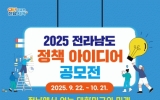 전라남도 윤규진 기자2025. 10.04[한국저널뉴스]전라남도가 새 정부의 실용주의 기조에 맞춰 ‘생활 속 불편을 찾고 이를 개선할, 지역의 미래를 먹여 살릴 정책’을 주제로 ‘2025년 전라남도 정책 아이디어 공모전’을 개최한다. 공모전은 대한민국 국민이라면 누구나 참여할 수 있다. 응모 기간은 오는 21일까지다. 분야는 ▲안전 및 생활불편 ▲신산업 및 일자리 ▲인구 대전환 프로젝트 ▲글로벌 문화·관광 거점 ▲농수축산업 육성, 5개다. 12월 중 자체 심사를 거쳐 우수 제안을 선정, 상장과 함께 시상금을 수여한다. 선정된 아이디어는 민선 8기 전남도정에 적극 반…