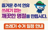 여수시 윤규진 기자2025. 09.26[한국저널뉴스]여수시는 다가오는 추석 연휴 기간 시민과 귀성객이 불편 없이 명절을 보낼 수 있도록 생활폐기물 수거 일정을 조정해 운영한다. 연휴 중 생활폐기물 수거는 ▲10월 5일 오전 5시부터 9시까지 단축 수거를 실시하며 ▲추석 당일 6일과 다음 날 7일에는 수거를 하지 않는다. 이외 ▲10월 3일, 4일, 8일, 9일은 평상시와 같이 정상 수거한다. 수거가 중단되는 휴무일에는 생활폐기물 기동처리반이 주요 도로변 수거와 긴급 민원 처리를 진행할 예정이다. 또한 시는 지난 9월 22일부터 10월 1일까지 ‘명절맞이 새단장 청…