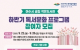 여수시 윤규진 기자2025. 09.22[한국저널뉴스]여수시는 9월 22일부터 26일까지 공립 작은도서관 ‘2025년 하반기 독서문화 프로그램’ 수강생을 모집한다. 이번 프로그램은 유아부터 성인까지 다양한 연령층이 참여할 수 있도록 총 9개로 마련됐으며 오는 10월부터 11월까지 프로그램별 총 6회씩 운영된다. 운영 작은도서관은 ▲여문늘벗(구 중부보건지소) ▲꿈을키우는(미평 선경 3차 아파트) ▲화양열린(화양면민회관 2층) ▲청솔글누리(돌산 청솔 2차 아파트) 등 4곳이다. 성인 대상 프로그램은 ▲시니어, 그림책 속 색감의 조화를 이루다 ▲글이 머무는 수채화 ▲나를…