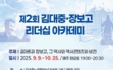 목포시 윤규진 기자2025. 09.08[한국저널뉴스](재)김대중노벨평화상기념관은 오는 9일부터 *‘김대중과 장보고, 그 역사 및 역사콘텐츠와 비전’을 주제로 '2025 김대중·장보고 리더십 아카데미'를 개최한다. 이번 아카데미는 국립목포대학교 호남문화콘텐츠연구소, 도서문화연구원, (사)장보고글로벌재단과 함께 진행하며, 전라남도와 (재)한국학호남진흥원이 후원한다. 아카데미는 김대중노벨평화상기념관 2층 다목적강당에서 9월 9일부터 매주 화요일에 열린다. 주요 강의 일정은 다음과 같다. 강의 일정은 ▲9월 9일 강봉룡 목포대 교수의 장보고는 문무대왕 해양설계의 실…