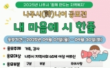 함평군 윤규진 기자2025. 08.28[한국저널뉴스]전라남도 나주시지역사회보장협의체 노인 실무분과는 관내 만 65세 이상 어르신을 대상으로 ‘2025년 나주시(詩)니어 제1회 내 마음에 시 한 줄 공모전’을 오는 9월 1일부터 9월 30일까지 개최한다. 이번 공모전은 나주시 거주 어르신이라면 누구나 편안하게 자신의 이야기를 담아 참여할 수 있도록 마련된 특화사업이다. 평소 문화·예술 활동에 익숙하지 않은 분들도 부담 없이 시 창작의 즐거움을 느끼고 이를 통해 삶의 순간과 감정을 글로 표현하며 지역사회에 따뜻한 울림을 전하는 것을 목표로 한다. 응모 주제는 ‘가족’ …