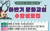 여수시 윤규진 기자2025. 08.13[한국저널뉴스]여수시립도서관은 쌍봉·현암·환경도서관에서 하반기 프로그램을 운영하고 이에 앞서 8월 18일부터 22일까지 5일간 9개 강좌 수강생 160명을 모집한다. 프로그램 운영 기간은 9월 1일부터 11월 25일까지며, 강좌별로 운영 기간과 시간이 다르다. 대상은 강좌별로 성인 또는 초등 저학년이다. 쌍봉도서관 개설 강좌는 성인 대상 ▲‘책놀이 지도사’ / 초등 저학년 대상 ▲‘그림책으로 배우는 영어’다. 현암도서관 개설 강좌는 성인 대상 ▲‘그림책 감정코칭 지도사(1급)’ ▲‘ESG 그림책 융합 지도사’다. 환경도서…